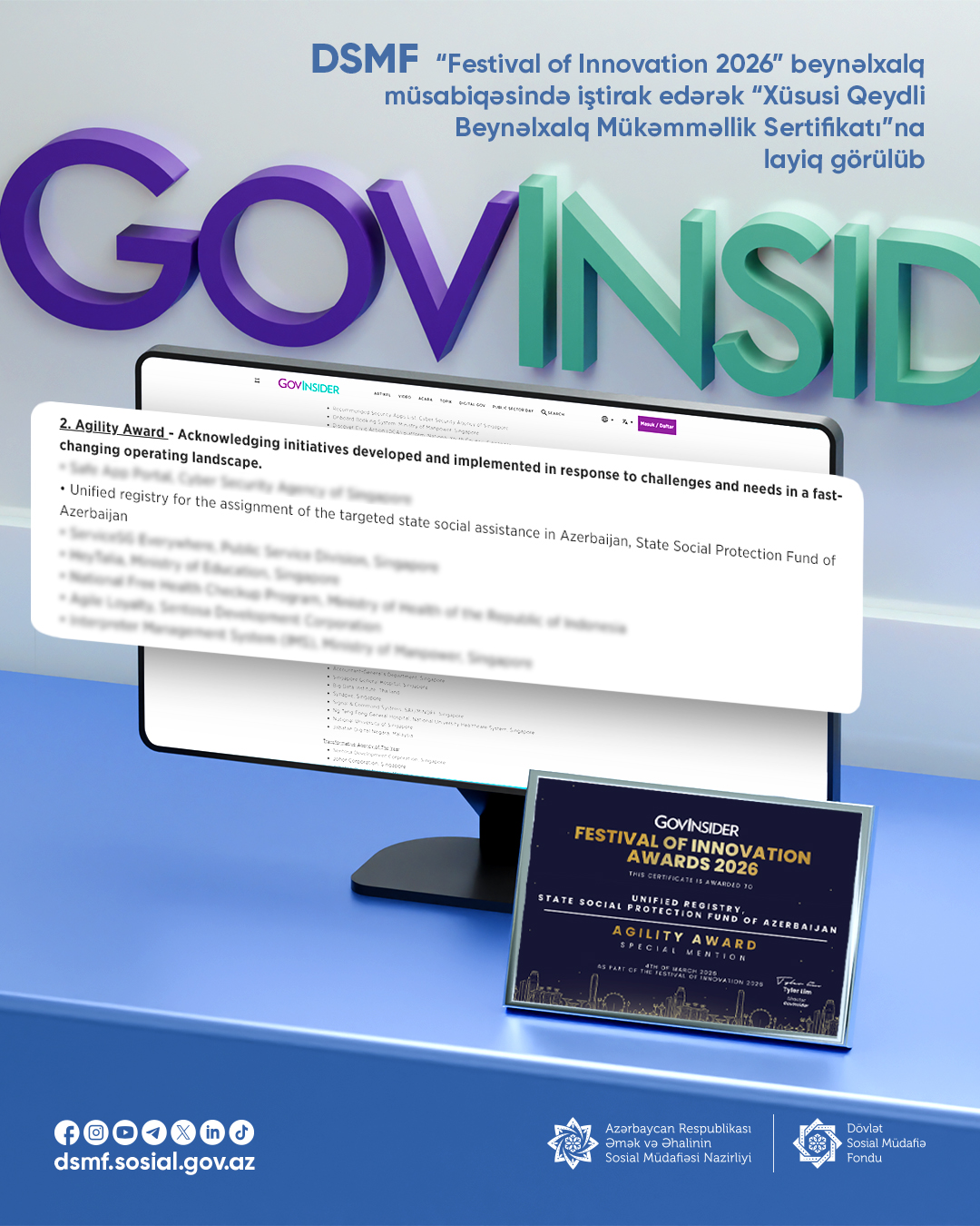 Sinqapurda “GovInsider” qurumunun keçirdiyi “Festival of Innovation Awards 2025” beynəlxalq müsabiqəsinin qalibərindən biri olub və Xüsusi Qeydli Mükəmməllik Sertifikatı