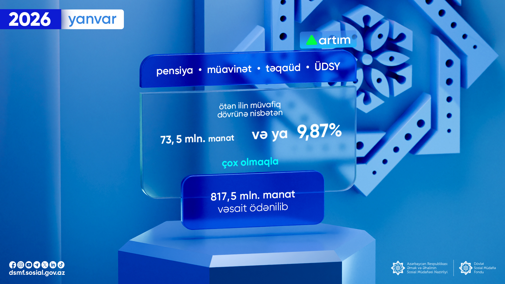 Cari ilin yanvar ayında sosial ödənişlər üzrə əhaliyə 817,5 milyon manat vəsait ödənilib