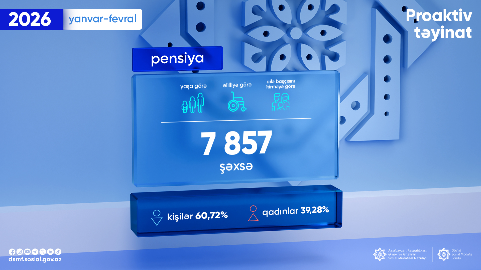 Cari ilin ilk iki ayı ərzində yaşa, əlilliyə və ailə başçısını itirməyə görə 7 857 nəfərə proaktiv qaydada pensiya təyin edilib