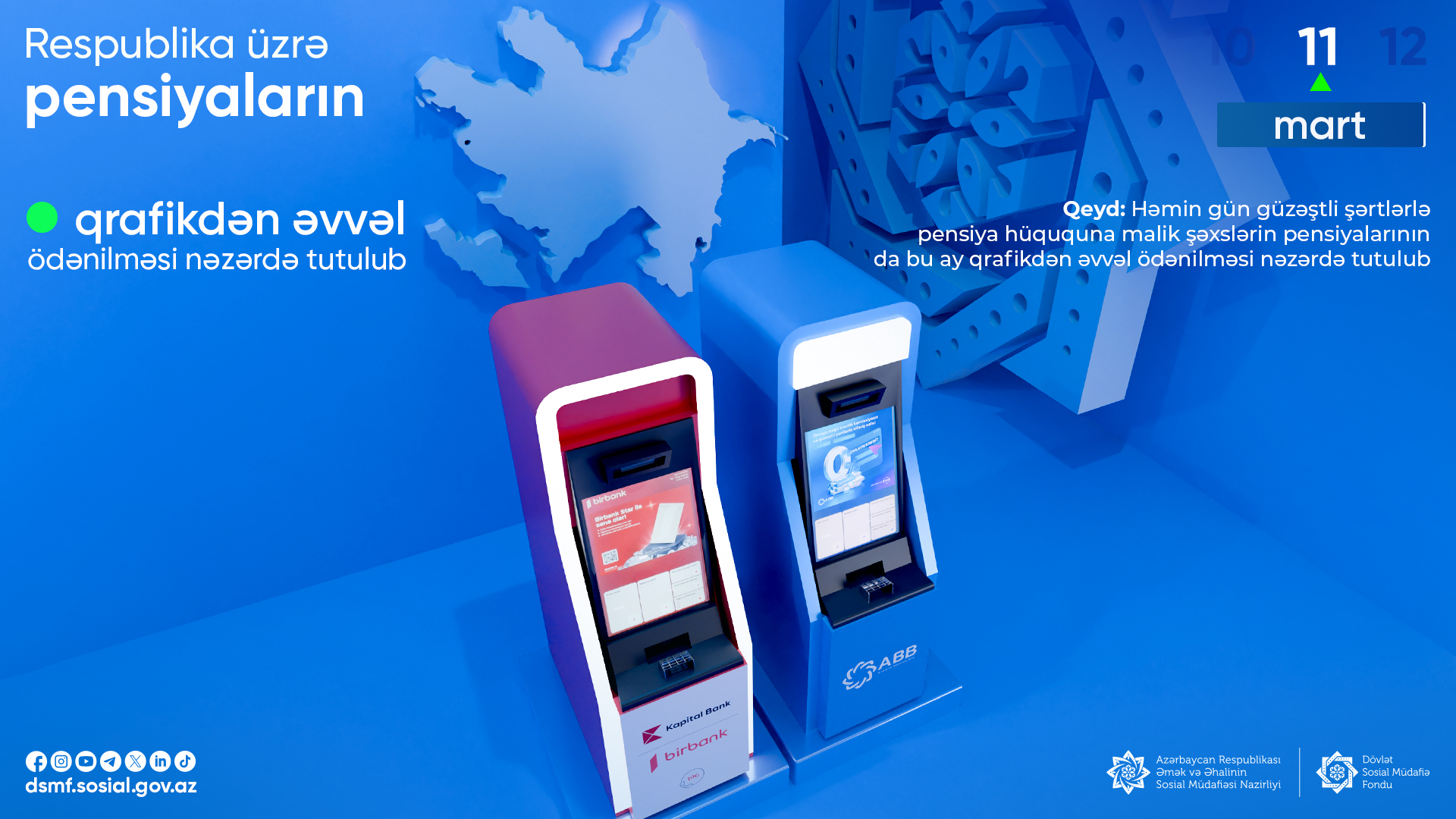 Bayramlarla əlaqədar olaraq respublika üzrə pensiyaların martın 11-də qrafikdən əvvəl tam ödənilərək yekunlaşdırılması nəzərdə tutulub