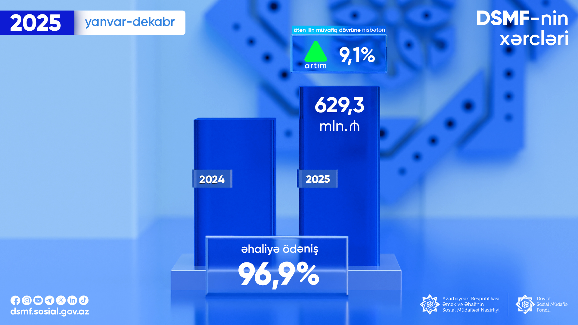 2025-ci ilin yanvar-dekabr ayları ərzində DSMF-nin xərcləri ötən ilin müvafiq dövrünə nisbətən 629,3 mln. manat və ya 9,1% artıb.