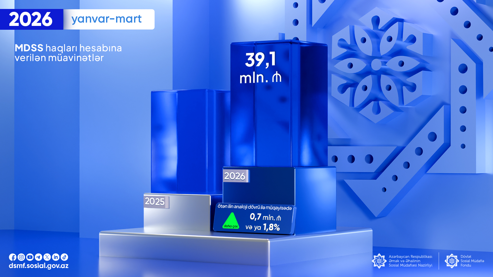 2026-cı ilin yanvar-mart ayları ərzində məcburi dövlət sosial sığorta haqları hesabına verilən müavinətlər üzrə 39,1 mln. manat vəsait ödənilib.