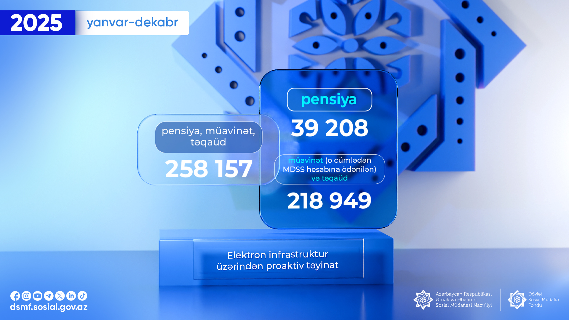 2025-ci ilin yanvar-dekabr ayları ərzində 258 157 pensiya, müavinət və təqaüd təyinatı elektron infrastruktur üzərindən proaktiv qaydada həyata keçirilib.