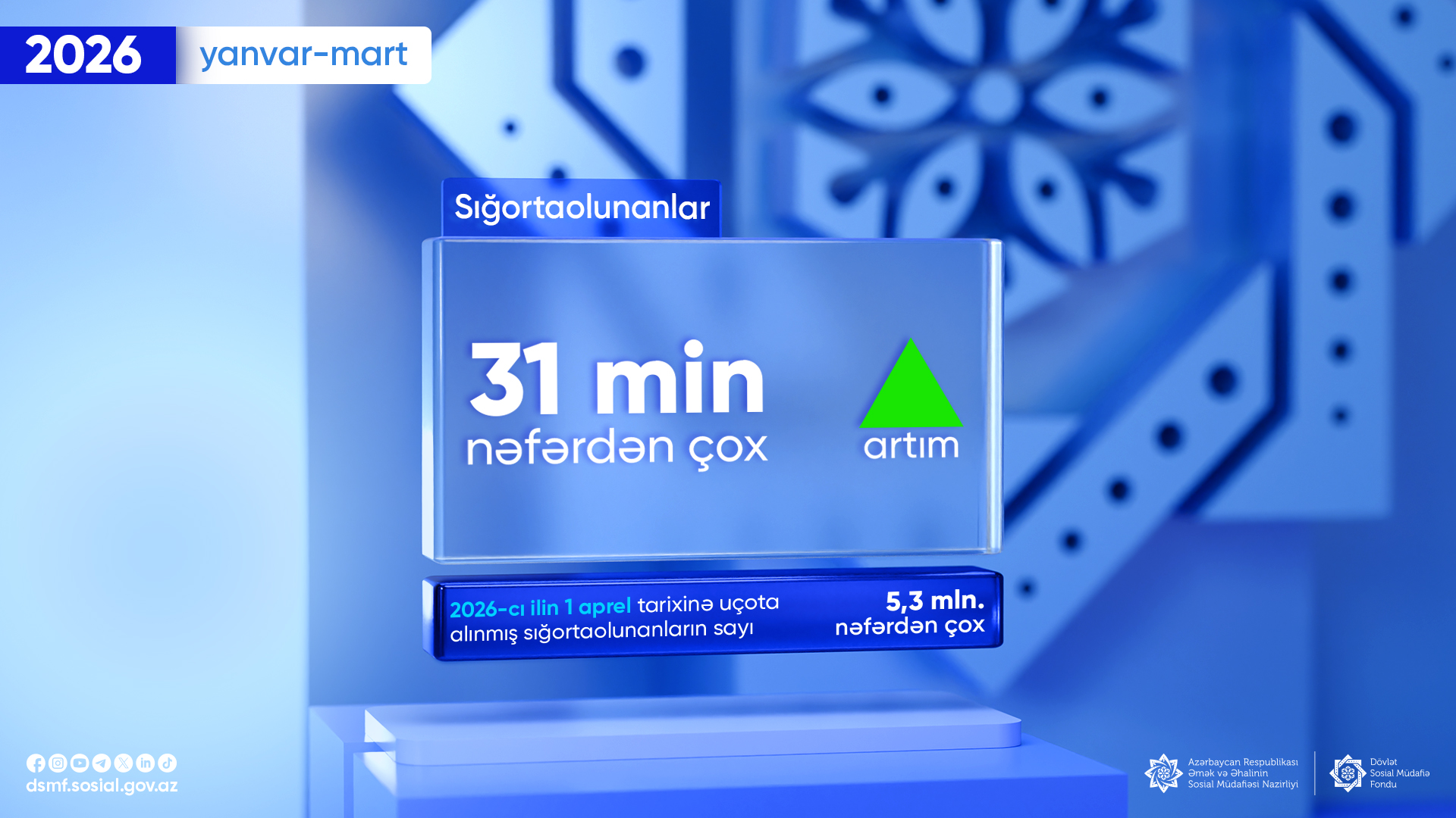 Beləliklə, 2026-cı ilin 1 aprel tarixinə uçota alınmış sığortaolunanların sayı 5,3 mln. nəfərdən çox olub.