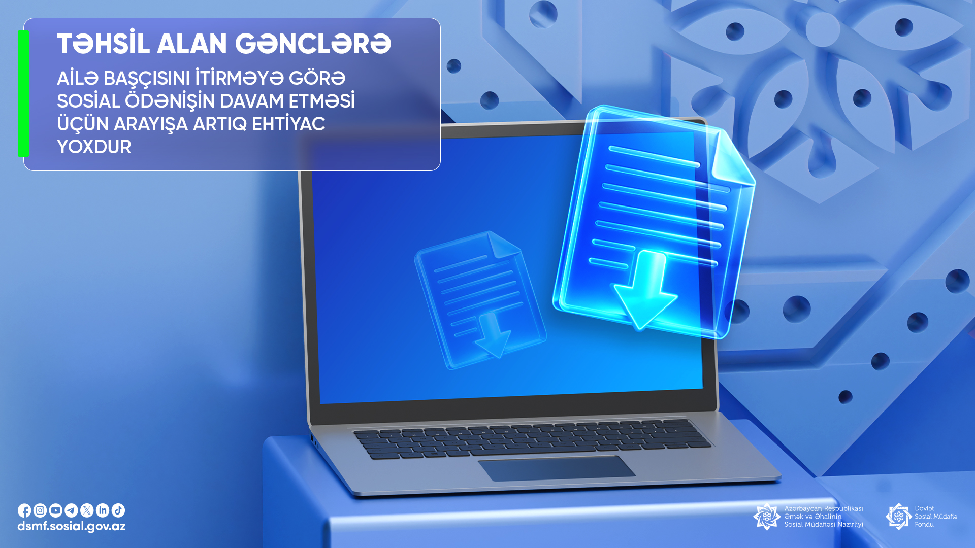 Vəfat etmiş və ya həlak olmuş şəxslərin ölkə daxilində əyani təhsil alan 23 yaşadək övladlarının əyani təhsil almaları barədə məlumatlar Dövlət İmtahan Mərkəzinin “Tələbə-Məzun” informasiya bazasından e-qaydada əldə olunur. Bununla da qeyd edilən ödənişin davam etdirilməsi prosesi avtomatik təmin edilir.