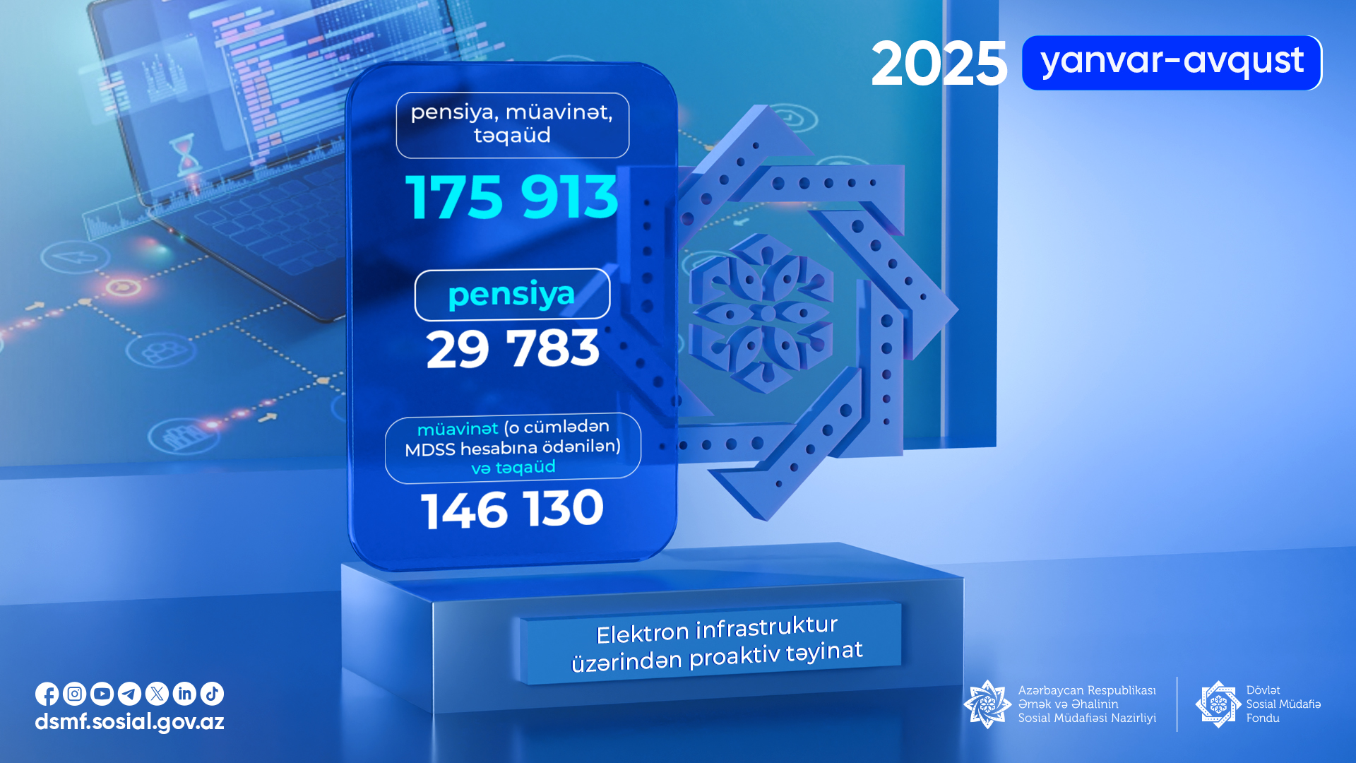 2025-ci ilin yanvar-avqust ayları ərzində 175 913 pensiya, müavinət və təqaüd təyinatı elektron infrastruktur üzərindən proaktiv qaydada həyata keçirilib.